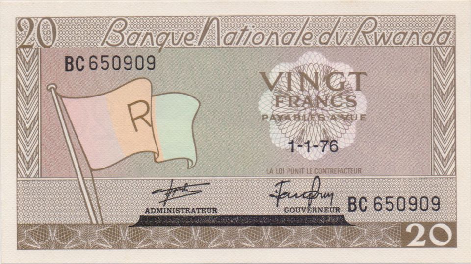 Fr 20 (20.000Franco do Ruanda)![]() ![]() dimensão: 125 x 70 mm US$ 0,02 |